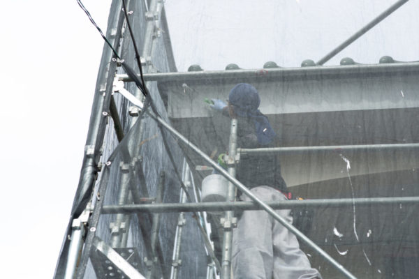 まず作業の手順として足場を組み、この足場をぐるりと包むように飛散防止シートを張り、高圧洗浄で汚れを落とします。